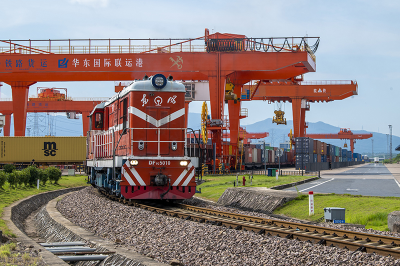 △2023年7月25日,在浙江省金華市華東國際聯(lián)運(yùn)港,一輛“義新歐”中歐班列裝載著110個(gè)標(biāo)箱日用百貨、家用電器、家裝材料等貨物,啟程駛向哈薩克斯坦。