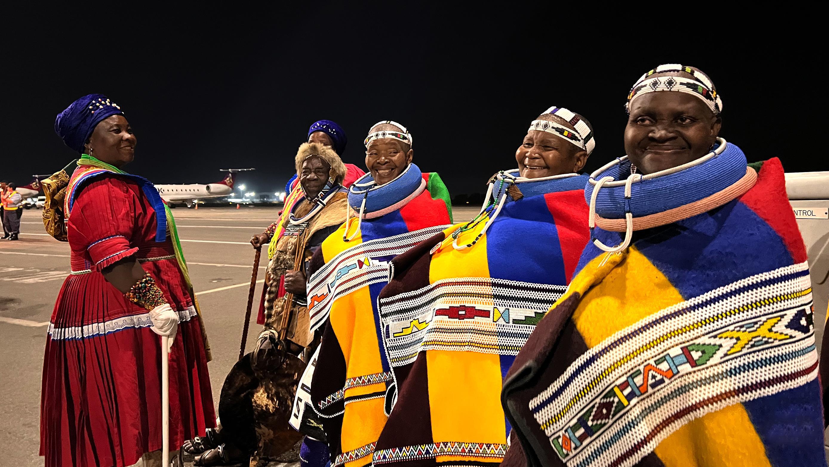 △當(dāng)?shù)貢r(shí)間2023年8月21日晚,習(xí)近平主席乘坐的專(zhuān)機(jī)抵達(dá)南非約翰內(nèi)斯堡坦博國(guó)際機(jī)場(chǎng),這是身穿民族服飾迎接的當(dāng)?shù)厝罕姟?/p>