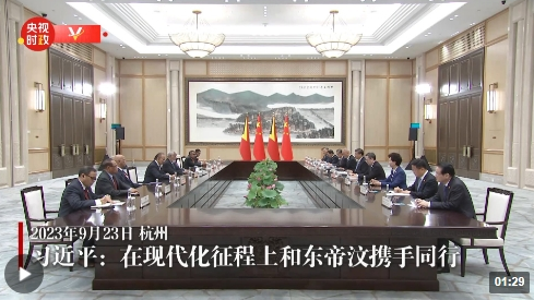 當(dāng)天,從上午到晚上,習(xí)近平主席在杭州會(huì)見多位亞洲國(guó)家領(lǐng)導(dǎo)人,為國(guó)際貴賓舉行歡迎宴會(huì),并同他們共同出席杭州亞運(yùn)會(huì)開幕式。從習(xí)主席在會(huì)見和致辭時(shí)的重要講話,到別具特色的歡迎宴會(huì)、精彩紛呈的開幕式,都傳遞了豐富的信息?!稌r(shí)政新聞眼》為你解讀。