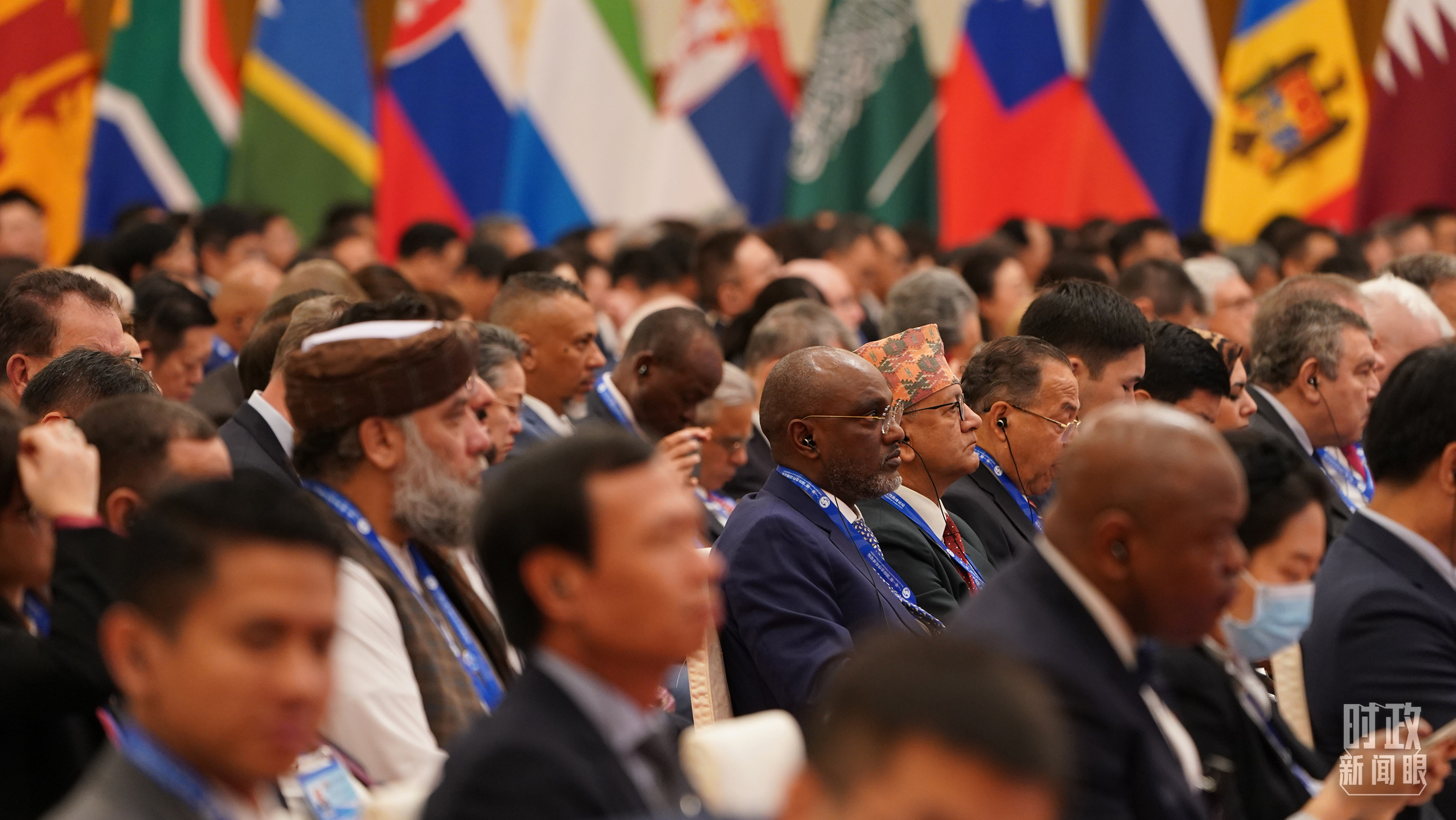 紅毯鋪地,鮮花點(diǎn)綴。150多面共建“一帶一路”國家國旗和聯(lián)合國旗,整齊分列會(huì)場兩側(cè)。