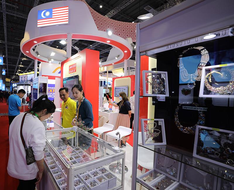 △2023年11月6日,參觀者在第六屆進(jìn)博會國家展馬來西亞展臺欣賞展出的珠寶首飾。