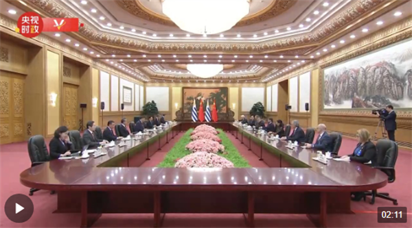 習近平指出,很高興同拉卡列總統(tǒng)先生見面,歡迎你對中國進行國事訪問。2023年是中烏關系史上特殊的一年,既是兩國建交35周年和烏拉圭加入共建“一帶一路”倡議5周年,也是你的父親、中國人民的老朋友拉卡列·埃雷拉前總統(tǒng)訪華30周年。總統(tǒng)先生這次訪華具有重要意義。