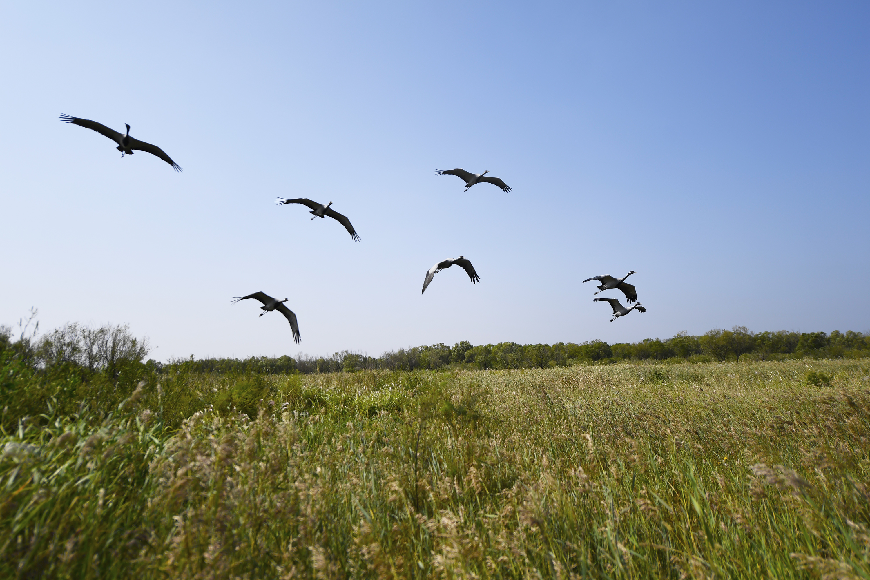 鳥(niǎo)類(lèi)在山東黃河三角洲國(guó)家級(jí)自然保護(hù)區(qū)內(nèi)飛翔(2022年9月18日攝)。新華社記者 范長(zhǎng)國(guó) 攝