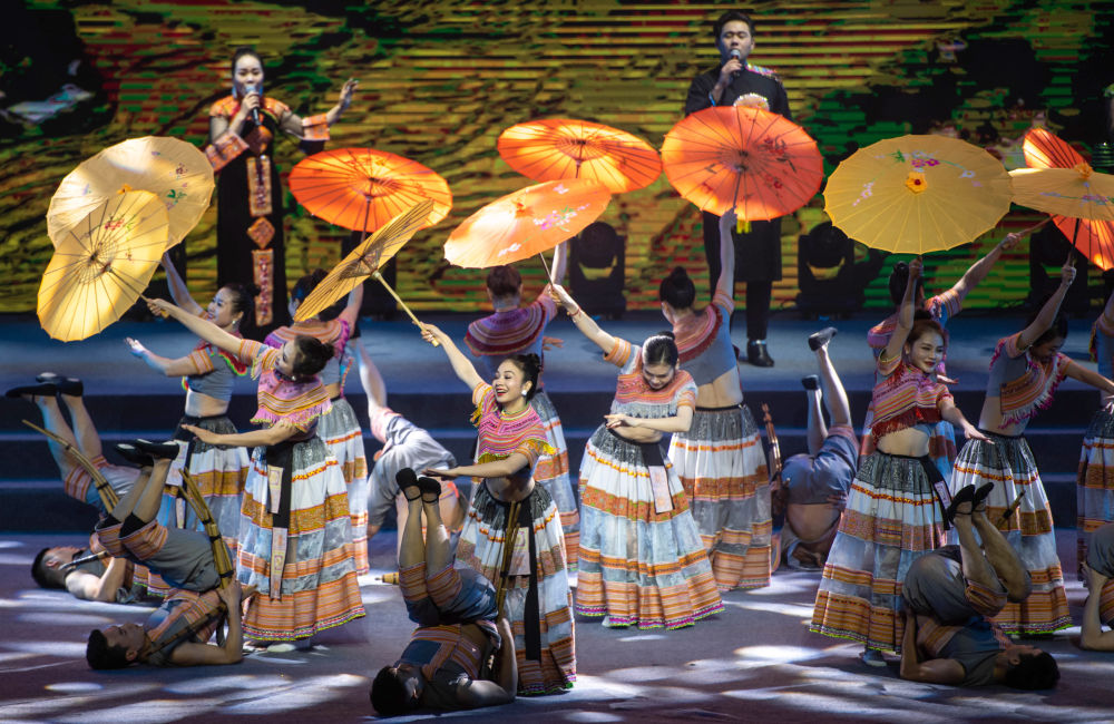 2023年1月18日,以“同心筑厚誼 攜手共發(fā)展”為主題的2023年中越跨國春節(jié)聯(lián)歡晚會在云南省紅河哈尼族彝族自治州河口瑤族自治縣舉行,越南老街省民族藝術(shù)歌舞團的演員在晚會上表演歌舞《漂浮在云端的節(jié)日》。新華社記者 胡超 攝