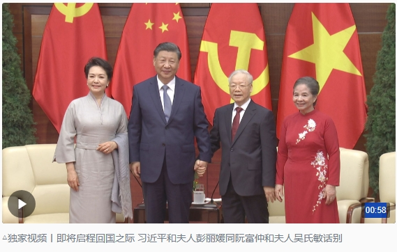 12月13日下午,在結束對越南進行國事訪問即將啟程回國之際,習近平夫婦同越共中央總書記阮富仲夫婦話別。一段對話,余韻悠長。