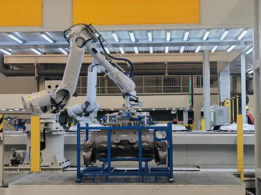 △陜西某品牌汽車工廠沖壓車間機(jī)器人正在自動抓件。