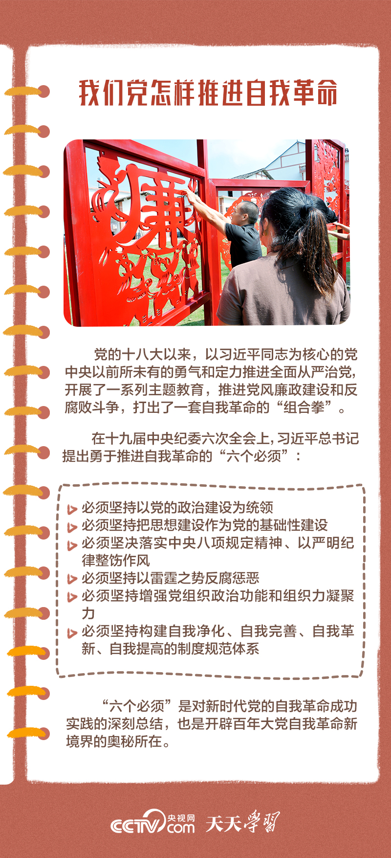 勇于自我革命是我們黨最鮮明的品格和最大的優(yōu)勢,總書記多次對推進(jìn)黨的自我革命作出重要部署。此次會議上,總書記深刻闡述了黨的自我革命的重要思想,明確提出需要把握好九個問題,并對持續(xù)發(fā)力、縱深推進(jìn)反腐敗斗爭作出戰(zhàn)略部署。央視網(wǎng)《天天學(xué)習(xí)》與您一起學(xué)習(xí)。