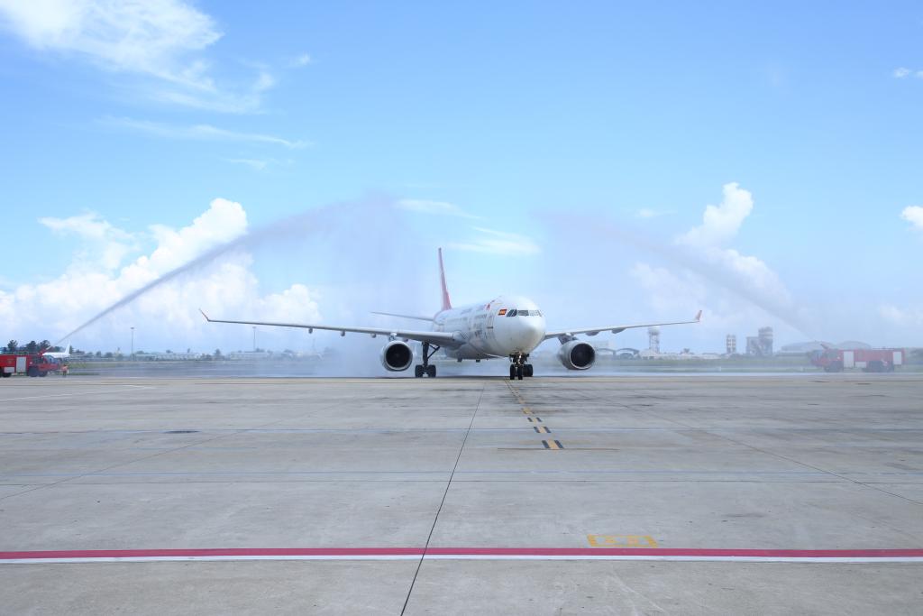 2023年1月18日,中國首都航空J(rèn)D455航班在馬爾代夫馬累維拉納國際機(jī)場(chǎng)接受水門禮。