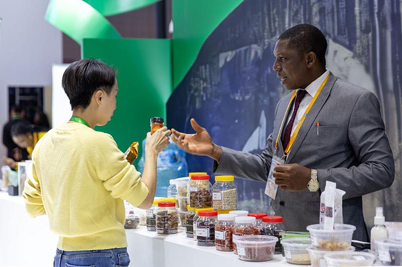 △2023年11月7日,在進博會國家館尼日利亞館,展商介紹尼日利亞產(chǎn)品。